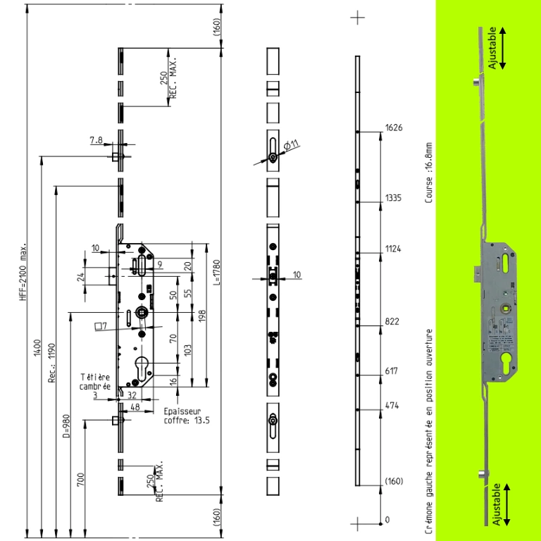 GU 6.35 CREMONE AXE 32 AVEC TET. EMBOUTIE AJUSTABLE HAUT & BAS. Serrure GU avec coffre axe 35 mm monté sur une tétière emboutie qui ramène l’axe à 32 mm lg 1780 mm ajustable haut et bas.
