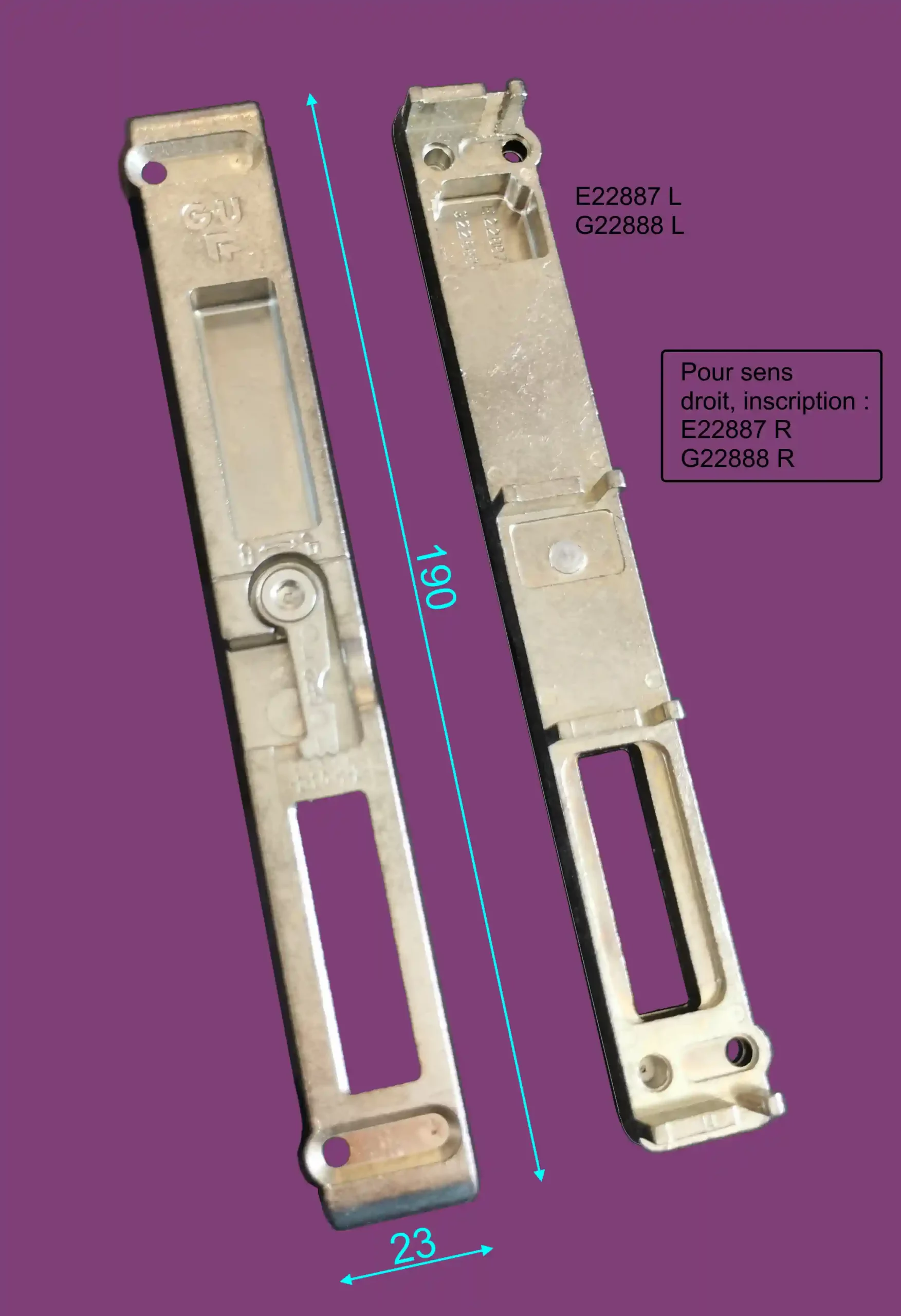 Gâche centrale GU FERCO E-22865-00-R-1 et E-22865-00-L-1 gravé à l’arri-re de la gâche E.22865.00.R ou E.22865.00.L selon sens