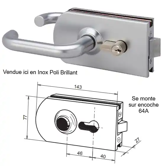 Serrure de milieu pour porte en verre inox poli béquille ronde courbée.